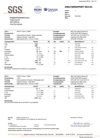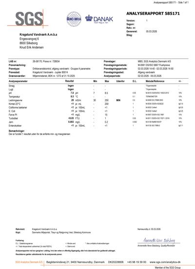Vi får undersøgt vandet på et godkendt laboratorium. Seneste vandanalyse fra Okt. 2024 viser.